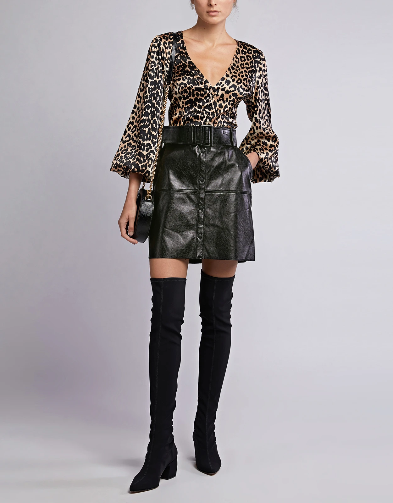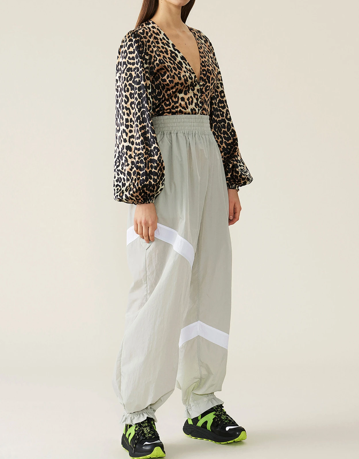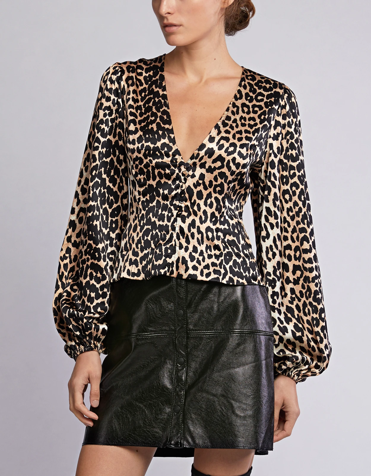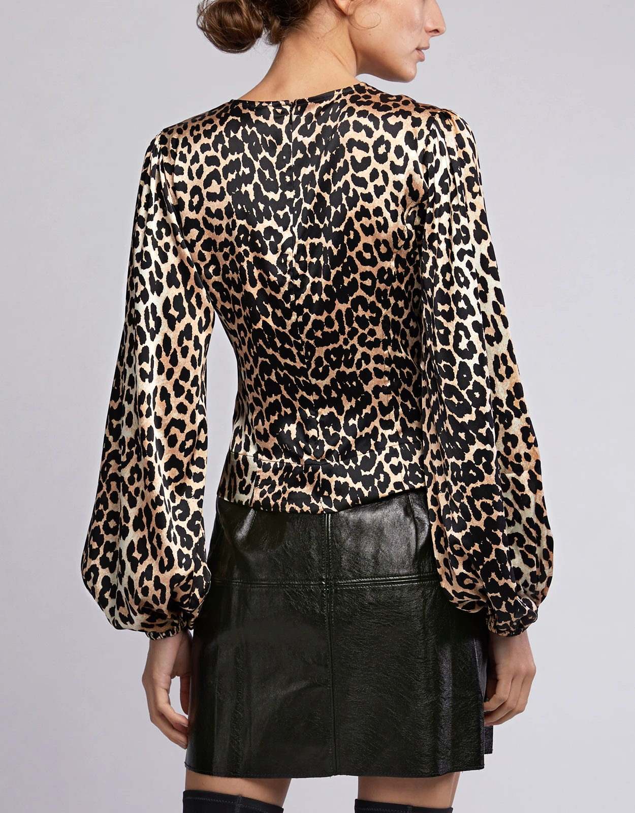 Ganni Leopard Print V-neck Silk-blend Satin Blouse