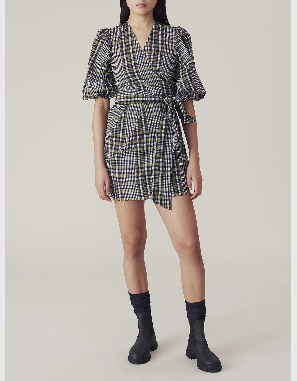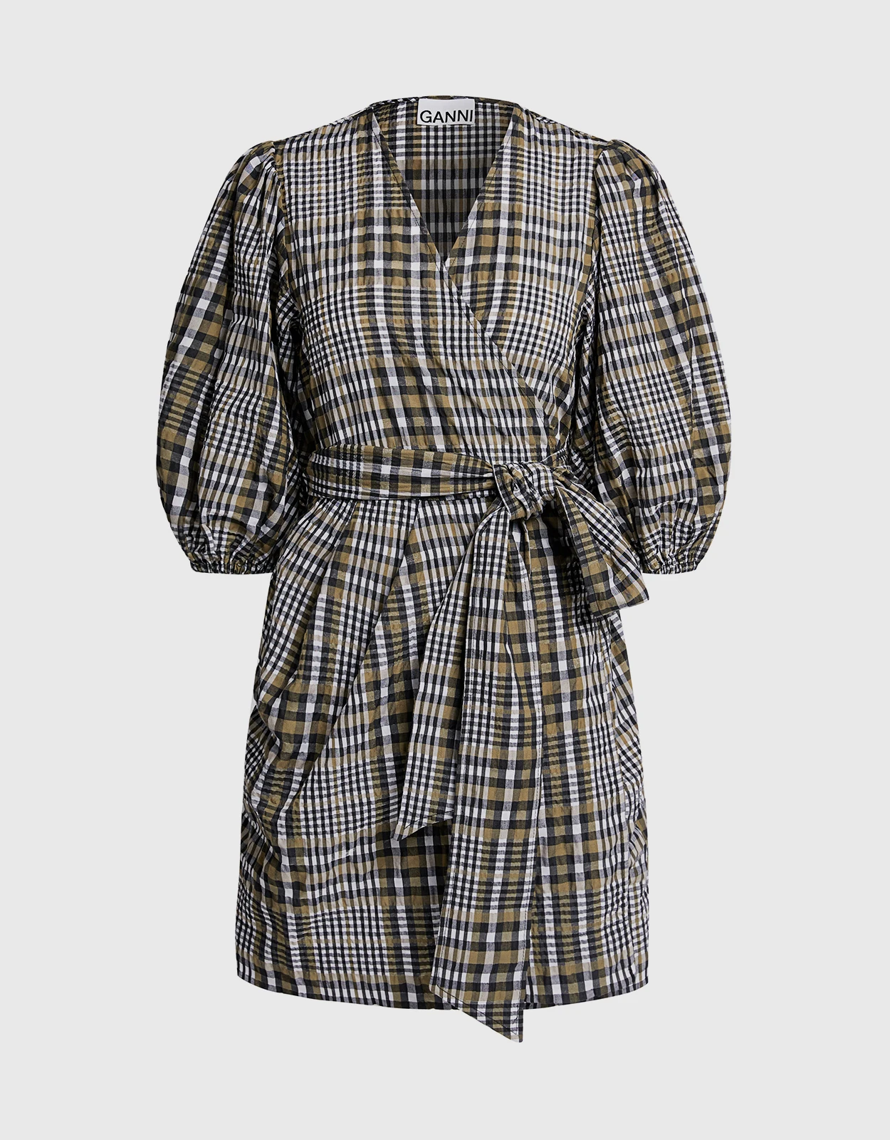 Ganni Seersucker Check Wrapped Mini Dress