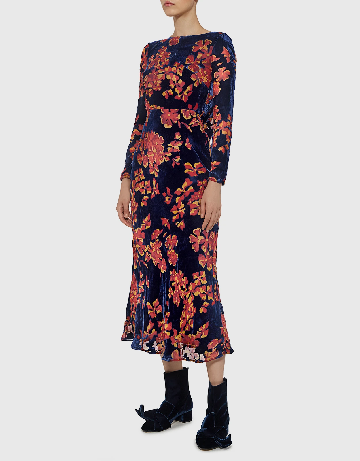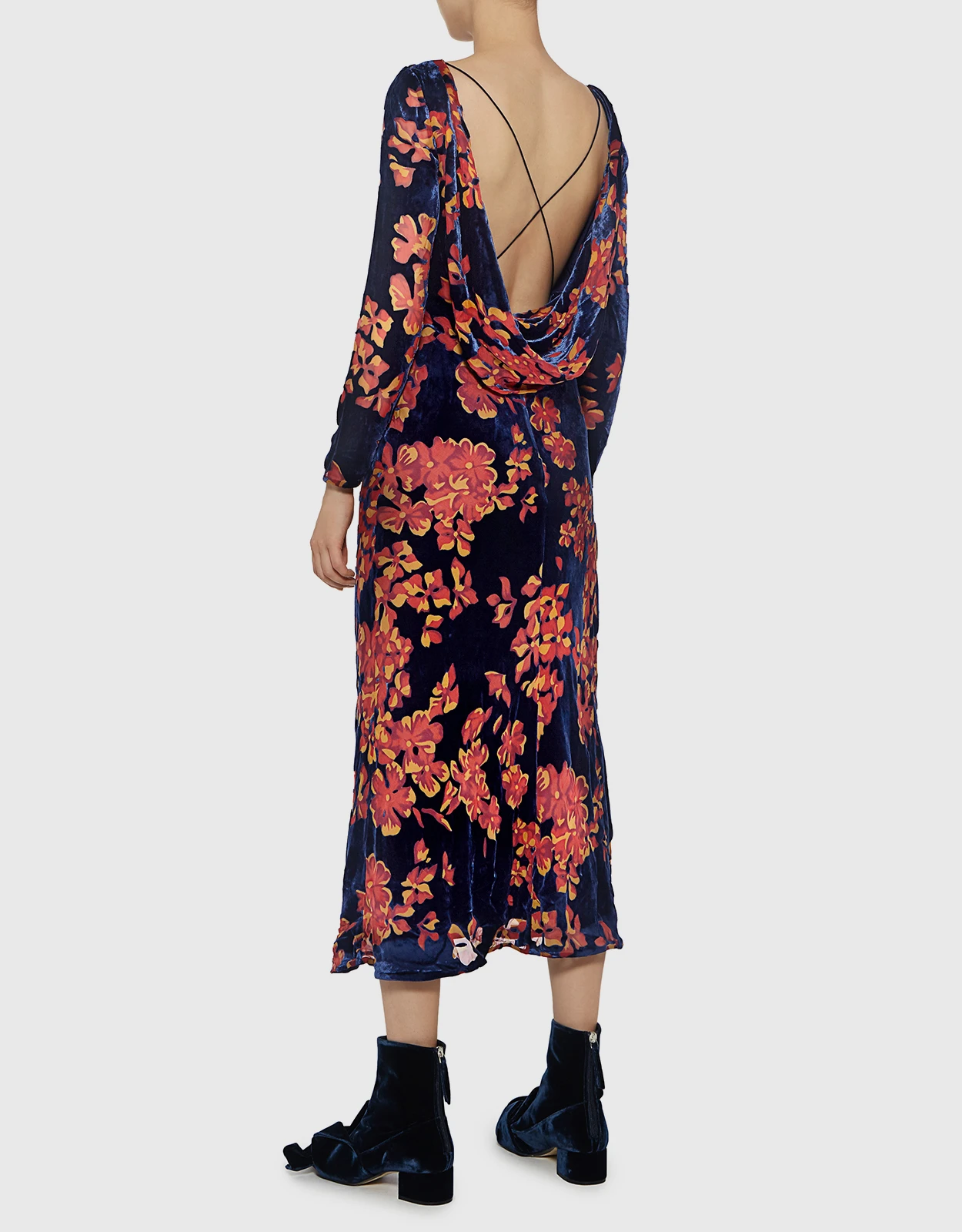 Saloni Tina Boat-neck Open Back Velvet Floral Midi Dress