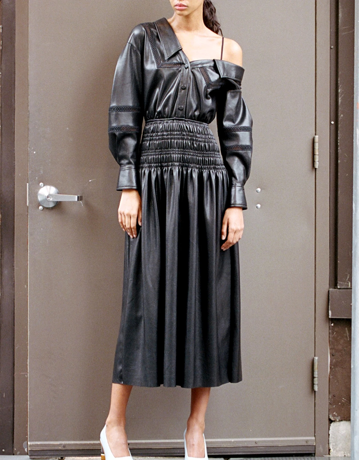 SELF PORTRAIT Self-Portrait Faux Leather Off-the-Shoulder Midi Dress